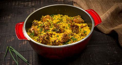 Se trata de un plato tradicional popular en las regiones de Goiás y Minas Geráis. En español puede traducirse como pollo, que es su componente principal. También requiere de arroz y azafrán para darle el típico color amarillo. Los brasileños suelen comer este plato en reuniones familiares e incluso para conservar el calor durante las noches frías.